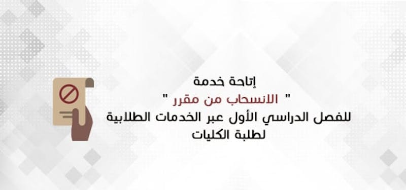 يبدأ تقديم طلب الانسحاب من مقرر لطلبة الكليات فقط​ للفصل الدراسي الأول يوم الأحد الموافق 13\01\1440 هـ عبر الخدمات الطلابية