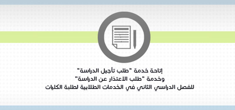 يبدأ تقديم طلب تأجيل الدراسة و الاعتذار عن الدراسة للفصل الدراسي الثاني يوم الأحد الموافق 01\05\1438 هـ عبر الخدمات الطلابية لطلبة الكليات فقط