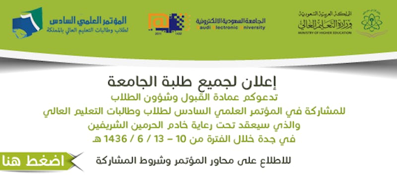 تعلن عمادة القبول وشؤون الطلاب عن أهمية المشاركة في المؤتمر العلمي السادس لطلاب وطالبات التعليم العالي والذي سينعقد بمشيئة الله تحت رعاية خادم الحرمين الشريفين في مدينة جدة خلال الفترة 10 – 13 / 6 / 1436 هـ ضمن المحاور التالية :