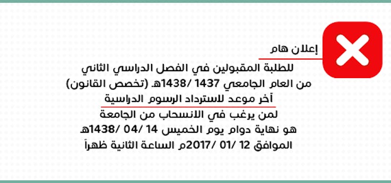 نود التنويه بأن آخر موعد لاسترداد الرسوم الدراسية لمن يرغب في الانسحاب من الجامعة في الفصل الدراسي الثاني 1437/1438هـ