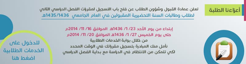 تعلن عمادة القبول وشؤون الطلاب عن فتح باب التسجيل لمقررات الفصل الدراسي الثاني لطلاب وطالبات السنة التحضيرية المقبولين في العام الجامعي 1435/1436هـ