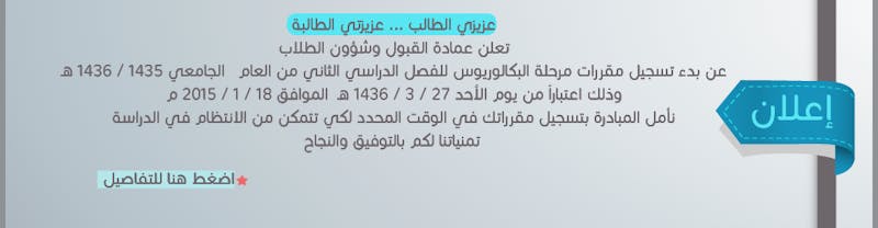 تعلن عمادة القبول وشؤون الطلاب عن بدء تسجيل مقررات مرحلة البكالوريوس للفصل الدراسي الثاني من العام الجامعي 1435 / 1436 هـ