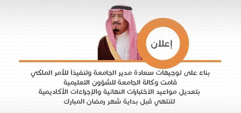 ناءً على توجيهات سعادة مدير الجامعة وتنفيذاً للأمر الملكي قامت وكالة الجامعة للشؤون التعليمية بتعديل مواعيد الاختبارات النهائية والإجراءات الأكاديمية لتنتهي قبل بداية شهر رمضان المبارك