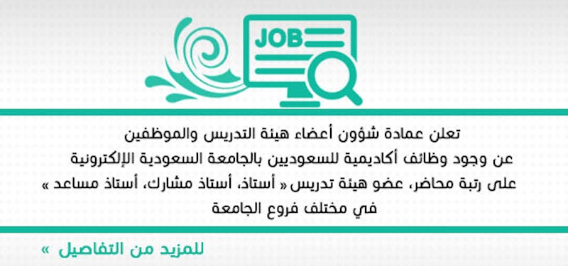 تعلن عمادة شؤون أعضاء هيئة التدريس والموظفين بالجامعة السعودية الإلكترونية عن وجود وظائف أكاديمية للسعوديين على رتبة محاضر، عضو هيئة تدريس (أستاذ، أستاذ مشارك، أستاذ مساعد)  في مختلف فروع الجامعة وذلك وفقاً للشروط التالية:
