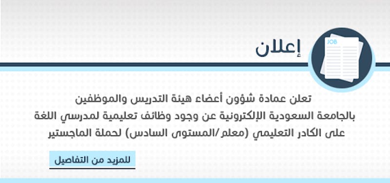 تعلن عمادة شؤون أعضاء هيئة التدريس والموظفين بالجامعة السعودية الإلكترونية عن وجود وظائف مدرسي لغة على الكادر التعليمي (معلم/المستوى السادس) لحملة الماجستير وذلك وفقاً للشروط التالية: