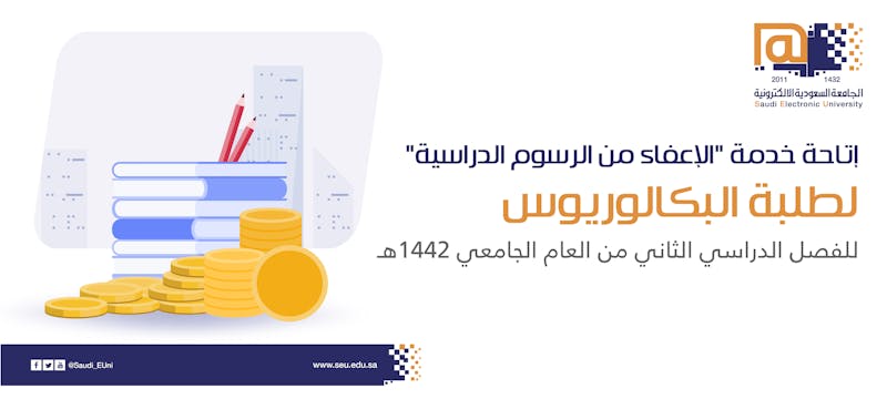 يبدأ تقديم طلب الإعفاء من الرسوم الدراسية للفصل الدراسي الثاني لطلبة برنامج البكالوريوس (السنة الأولى المشتركة وطلبة التخصص) عبر الخدمات الطلابية من يوم الأحد الموافق 26 \ 05 \ 1442 هـ وينتهي يوم الأحد الموافق 11 \ 10 \ 1442 هـ في تمام الساعة الثانية ظهرًا.