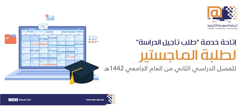 تعلن عمادة الدراسات العليا لطلبتها عن إتاحة خدمة طلب تأجيل الدراسة للفصل الدراسي الثاني من العام الجامعي 1442هـ