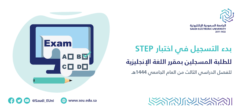 تعلن عمادة السنة الأولى المشتركة للطلبة المسجلين بمقرر اللغة الإنجليزية للفصل الثالث من العام الجامعي 1444هـ بضرورة الدخول على موقع قياس والتسجيل في اختبارSTEP