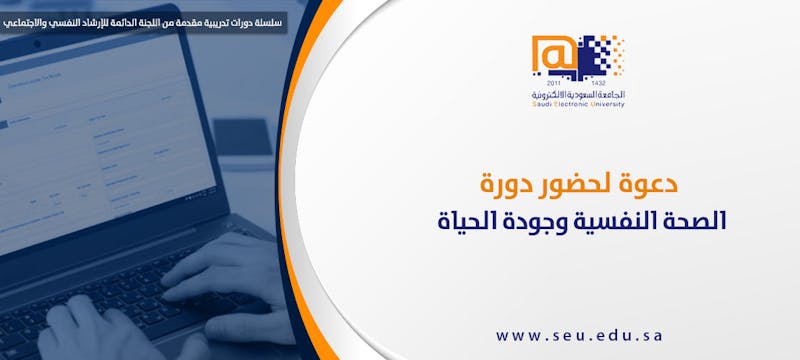 يسر اللجنة الدائمة للإرشاد النفسي والاجتماعي بالجامعة السعودية الإلكترونية دعوتكم لحضور دورة بعنوان: الصحة النفسية وجودة الحياة.