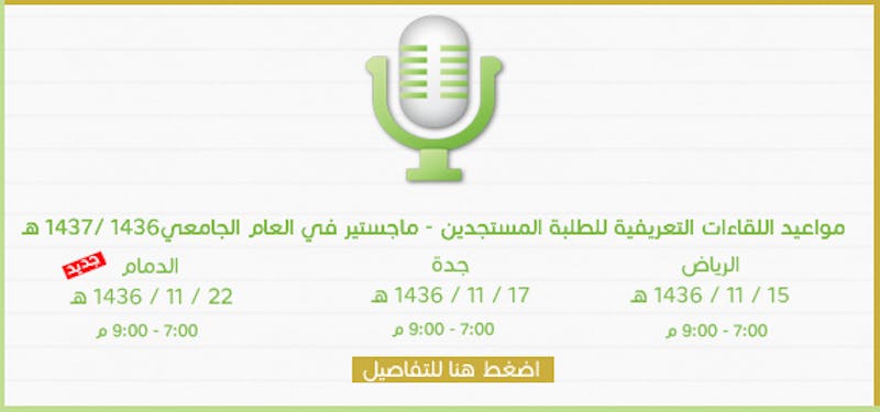 تتشرف عمادة الدراسات العليا بدعوتكم لحضور اللقاء التعريفي لطلبة الدراسات العليا المستجدين للعام الجامعي 1436 / 1437هـ