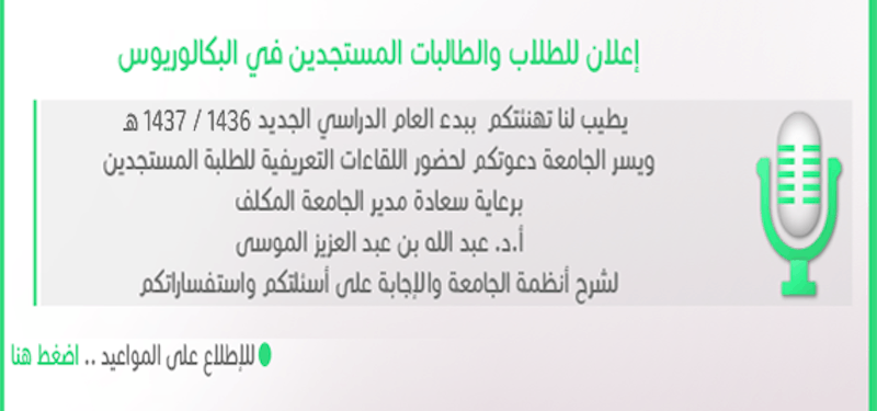 أ.د. عبد الله بن عبد العزيز الموسى يسرنا دعوتكم لحضور اللقاءات التعريفية لطلاب وطالبات مرحلة البكالوريوس من المقبولين لهذا العام وذلك للاطلاع على أنظمة الجامعة وللإجابة على أسئلتكم واستفساراتكم.