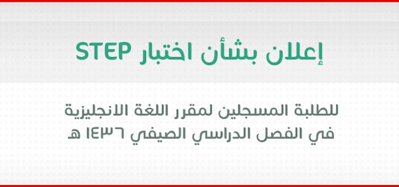 تهيب عمادة السنة التحضيرية للطلبة المسجلين لمقرر اللغة الانجليزية في الفصل الداراسي الصيفي بضرورة الدخول على موقع قياس والتسجيل في الفترة من 19/ 9 / 1436 هـ حتى 25/ 9 / 1436 هـ في اختبارSTEP والذي سيعقد في الفترة من 17/ 10 / 1436 هـ الى 21/ 10 / 1436 هـ قبل إنتهاء المقاعد المحددة ، كما أن رسوم الاختبار مدفوعة مسبقاً من قبل الجامعة.