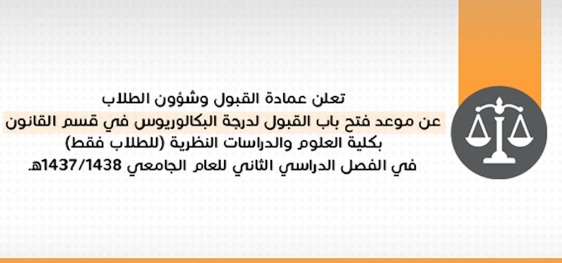 تعلن عمادة القبول وشؤون الطلاب عن موعد فتح باب القبول لدرجة البكالوريوس في قسم القانون بكلية العلوم والدراسات النظرية ( للطلاب فقط )