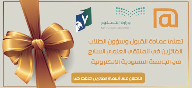 يسر عمادة القبول وشؤون الطلاب أن تبارك للطلبة الفائزين جميعاً ، و تتمنى لمن لم يحالفهم الحظ مزيداً من التوفيق في المشاركات القادمة ،حيث تلقت لجان التحكيم في الملتقى العلمي السابع في الجامعة السعودية الالكترونية العديد من المشاركات الطلابية وفقاً للمحاور المحددة في المؤتمر الطلابي السابع بتنظيم وزارة التعليم والإجراءات الخاصة بذلك ،وقد قامت لجان التحكيم المشكّلة من عدد من المحكمين المختصين بجهود كبيرة لفرز وتحكيم وإجراء المفاضلة لكافّة المشاركات الطلابيّة للمحاور المحددة وقد أقيم يومي الاثنين والثلاثاء 3-4/7 /1437 هـ .