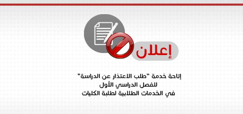 يبدأ تقديم طلب الاعتذار عن الدراسة للفصل الدراسي الأول يوم الأحد الموافق 26\12\1438 هـ عبر الخدمات الطلابية لطلبة الكليات فقط