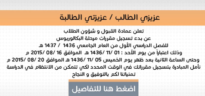 لمعرفة التفاصيل الخاصة بتسجيل المقررات للفصل الدراسي الأول 1436 /1437 هـاضغط هنا