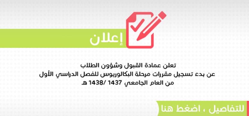 تعلن عمادة القبول وشؤون الطلاب عن فتح باب تسجيل مقررات مرحلة البكالوريوس للفصل الدراسي الأول من العام الجامعي 1437/ 1438 هـ وفق التفاصيل التالية :