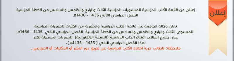 على جميع الطلاب اقتناء الكتب الدراسية (النسخة الالكترونية) للمقررات المسجلة لهم لهذا الفصل الدراسي (الأول 1435-1436هـ) ،