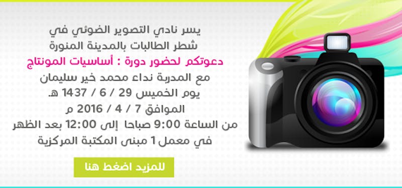 يسر نادي التصوير الضوئي في شطر الطالبات بالمدينة المنورة دعوتكم لحضور دورة : أساسيات المونتاج