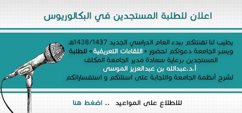 أدناه معلومات هامّة تخص اللقاءات التعريفية التي ستُعقد للطلبة المستجدين في بداية الفصل الدراسي الأول من العام الجامعي 1438/1437هـ.