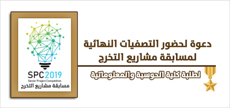 يسر كلية الحوسبة والمعلوماتية دعوتكم لحضور آخر التصفيات النهائية لمسابقة مشاريع التخرج لطلبة الكلية على مستوى جميع الفروع بشطريها (طلاب/طالبات) وحضور المعرض المصاحب