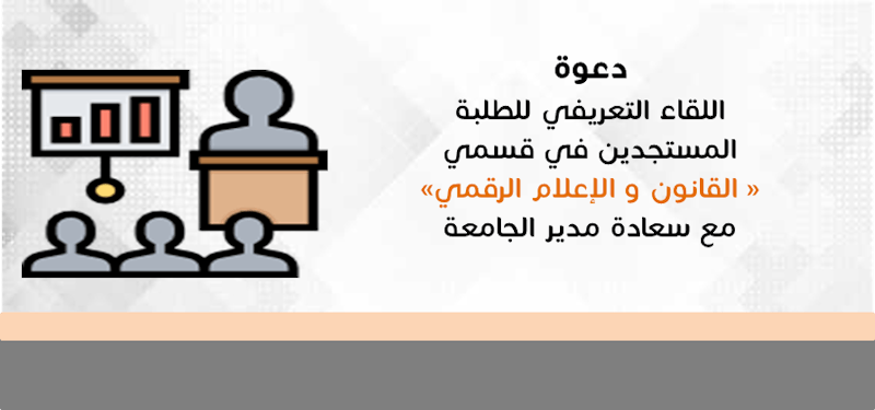 يسرنا دعوتكم لحضور اللقاءات التعريفية لطلاب وطالبات مرحلة البكالوريوس المقبولين في تخصصي القانون و الإعلام الرقمي لهذا العام
