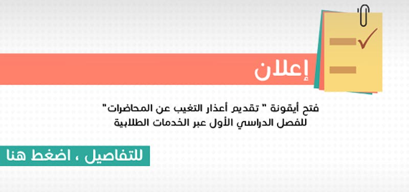 يبدأ تقديم أعذار التغيب عن المحاضرات للفصل الدراسي الأول يوم الخميس الموافق 09\03\1438 هـ عبر الخدمات الطلابية