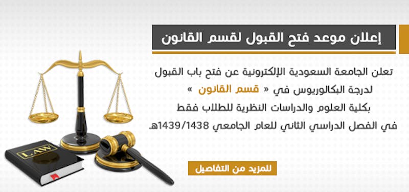 تعلن الجامعة السعودية الإلكترونية عن موعد فتح باب القبول لدرجة البكالوريوس في قسم القانون بكلية العلوم والدراسات النظرية (للطلاب فقط) في الفصل الدراسي الثاني للعام الجامعي 1438 /1439هـ,