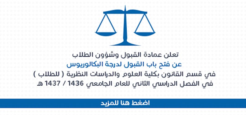 تعلن عمادة القبول وشؤون الطلاب عن فتح باب القبول لدرجة البكالوريوس في قسم القانون بكلية العلوم والدراسات النظرية ( للطلاب فقط )