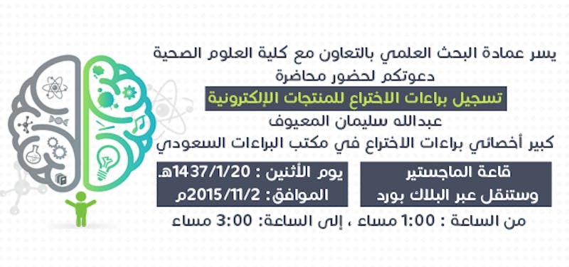 يسر عمادة البحث العلمي بالتعاون مع كلية العلوم الصحية دعوتكم لحضور محاضرة تسجيل براءات الاختراع للمنتجات الإلكترونية