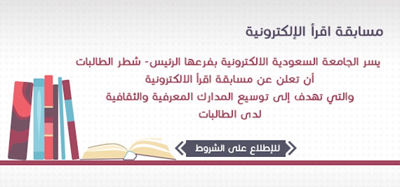 يسر الجامعة السعودية الالكترونية أن تعلن عن مسابقة اقرأ الإلكترونية والتي تهدف الى توسيع المدارك المعرفية والثقافية لدى الطالبات