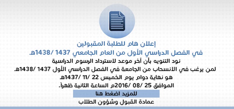 إعلان هام للطلبة المقبولين في الفصل الدراسي الأول من العام الجامعي 1437 /1438هـ نود التنويه بأن آخر موعد لاسترداد الرسوم الدراسية لمن يرغب في الانسحاب من الجامعة في الفصل الدراسي الأول 1437 /1438هـ هو نهاية دوام يوم الخميس 22 /11 /1437هـ الموافق 25 /08 /2016م الساعة الثانية ظهراً.