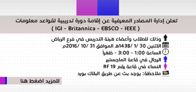 تعلن إدارة المصادر المعرفية عن إقامة دورة تدريبية لقواعد معلومات (EBSCO - IEEE -IGI- Britannica) للطلاب وأعضاء هيئة التدريس في فرع الرياض