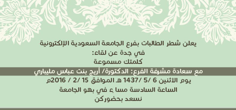 يعلن شطر الطالبات بفرع الجامعة السعودية الإلكترونية في جدة عن لقاء كلمتك مسموعة