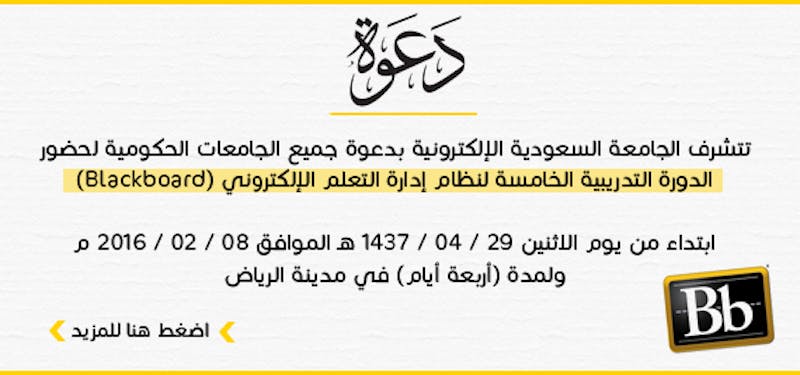 تتشرف الجامعة السعودية الإلكترونية بالتعاون مع الوكيل الحصري لشركة بلاك بورد في الشرق الأوسط (BME) بتنظيم الدورة التدريبية الخامسة لنظام إدارة التعلم الإلكتروني (Blackboard)، والتي تستهدف أعضاء هيئة التدريس في الجامعات السعودية الحكومية، وتهتم بتدريبهم على أسس التعامل مع المحتوى التعليمي وكيفية إدارته، وشرح أفضل طريقة للتدريس وتطبيق أفضل الممارسات والاستفادة من الخبرات السابقة، وكيفية تفعيل أدوات التواصل داخل المقرر الدراسي ومتابعة الطلبة بمنتهى الدقة، ومراقبة كفاءة العملية التعليمية وتقييمها بما يتوافق مع رؤية المؤسسة التعليمية، ومعرفة الأدوات والوسائل المتاحة لأعضاء هيئة التدريس، وفي نهاية الدورة سيتم منح شهادات معتمدة للحضور المشاركين في الدورة.