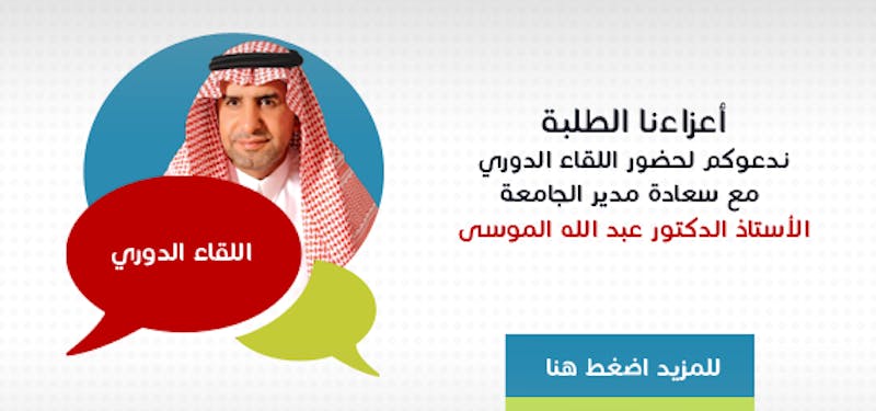 ندعوكم لحضور اللقاء الدوري مع سعادة مدير الجامعة عن طريق نظام الفصول الإفتراضية ( البلاك بورد ) حيث ستجد عزيزي الطالب / الطالبة رابط الاجتماع من ضمن المواد الدراسية الخاصة بك .