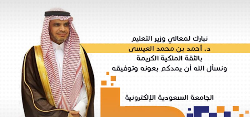 الجامعة السعودية الإلكترونية تبارك لمعالي وزير التعليم بالثقة الملكية.