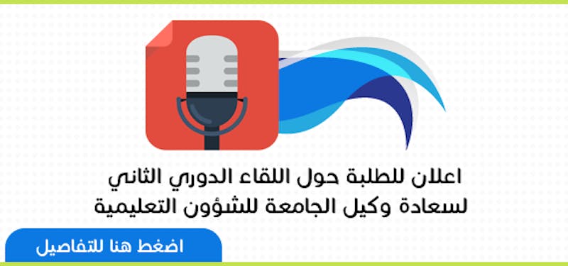 ندعوكم لحضور اللقاء الدوري الثاني لسعادة وكيل الجامعة للشؤون التعليمية الأستاذ الدكتور عبد الله بن عمر النجار بالطلبة عن طريق نظام الفصول الإفتراضية ( البلاك بورد ) حيث سيكون رابط اللقاء الافتراضي ضمن قائمة المواد الدراسية الخاصة بك على نظام البلاك بورد