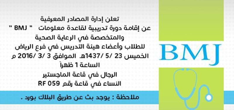 تعلن إدارة المصادر المعرفية عن إقامة دورة تدريبية لقاعدة معلومات " BMJ " والمتخصصة في الرعاية الصحية