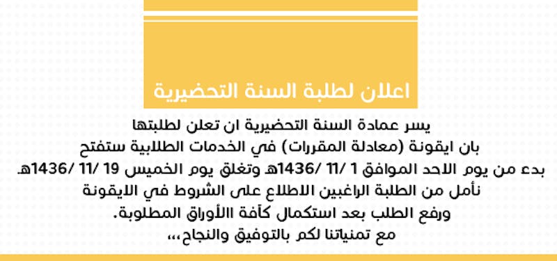 تعلن عمادة السنة التحضيرية لطلبتها بأن أيقونة (معادلة المقررات) في الخدمات الطلابية ستفتح بدء من يوم الأحد 1 / 11 / 1436 هـ