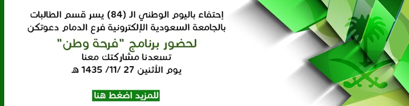إحتفاءً باليوم الوطني الـ (84) يسر قسم الطالبات بالجامعة السعودية الإلكترونية فرع الدمام دعوتكن لحضور برنامج "فرحة وطن" و المشاركة في مسابقة :
