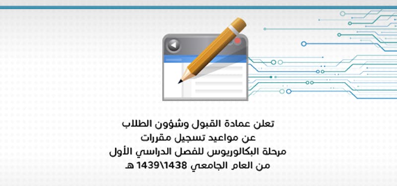 تعلن عمادة القبول وشؤون الطلاب عن موعد تسجيل المقررات الدراسية لمرحلة البكالوريوس للفصل الدراسي الأول من العام الجامعي 1438/ 1439 هـ