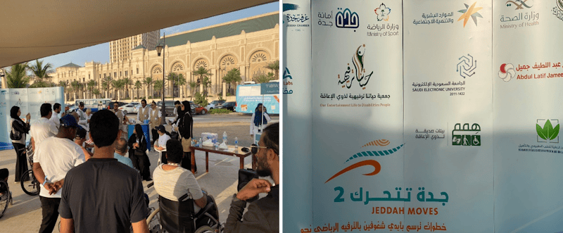 شارك فرع الجامعة السعودية الإلكترونية في جدة، بالتعاون مع جمعية حياتنا الترفيهية لذوي الإعاقة في مبادرة "جدة تتحرك" في نسختها الثانية، والتي أطلقها صاحب السمو الأمير سعود بن عبد الله بن جلوي محافظ جدة، بواجهة روشن البحرية، وسط تنافس أكثر من5000 مشارك ومشاركة من مختلف الفئات العمرية، وحضور عدد من مسؤولي القطاعات الحكومية والمهتمين بالشؤون الرياضية والصحية. وسط مشاركة متميزة من جمعية حياتنا الترفيهية بأيدي الشغوفين من ذوي الإعاقة بالترفيه الرياضي، حيث قدموا العديد من الفقرات الترفيهية المتنوعة.