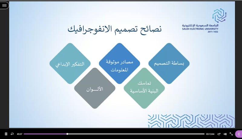 نظمت وحدة الأنشطة الطلابية بفرع الجامعة السعودية الالكترونية بجدة، يوم الأربعاء بتاريخ ١٣/١١/١٤٤٢هـ الموافق ٢٣/٠٧/٢٠٢١م، دورة تدريبية بعنوان: تصميم الانفوجرافيك باستخدام البوربوينت، قدمتها الأستاذة أفنان سراج النهدي رئيسة الأنشطة الطلابية لشطر الطالبات بفرع جدة، واستهدفت جميع طلبة الجامعة السعودية الإلكترونية.