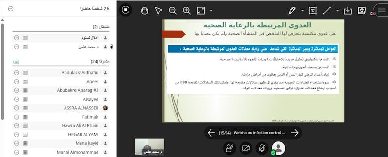 وتناول الدكتور عثمان عدة محاور شملت مفهوم حلقة العدوى ومكوناتها، والعدوى المرتبطة بالرعاية الصحية، ودور المراقبة والتقييم في الوقاية من العدوى، إضافة إلى أساليب التطهير والتعقيم، مؤكداً أهمية الالتزام بالإجراءات الوقائية للحد من انتقال العدوى في بيئات الرعاية الصحية.