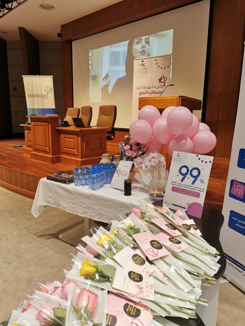 تزامنًا مع شهر أكتوبر للتوعية بسرطان الثدي، نظمت وحدة الخدمة المجتمعية والأنشطة الطلابية بفرع الجامعة السعودية الإلكترونية بنجران، بالتعاون مع مستشفى الملك خالد بمنطقة نجران، مبادرة التوعية بسرطان الثدي تحت شعار "رايتك وردية".