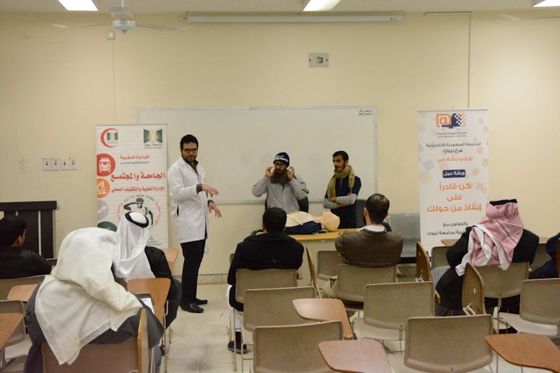 نظم فرع الجامعة السعودية الإلكترونية بتبوك ورشة عمل لطلاب ومنسوبي الفرع تحت عنوان "كن قادرا على انقاذ من حولك"، وذلك في مقر الفرع يوم الأربعاء الماضي، وقدمها الدكتور محمود مبارك.