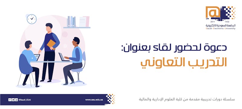 سعيًا لخلق فرصة للتعامل مع بيئة عمل حقيقة، يسر وحدة الأنشطة الطلابية كلية العلوم الإدارية والمالية بالجامعة السعودية الإلكترونية دعوتكم لحضور لقاء بعنوان: التدريب التعاوني.
