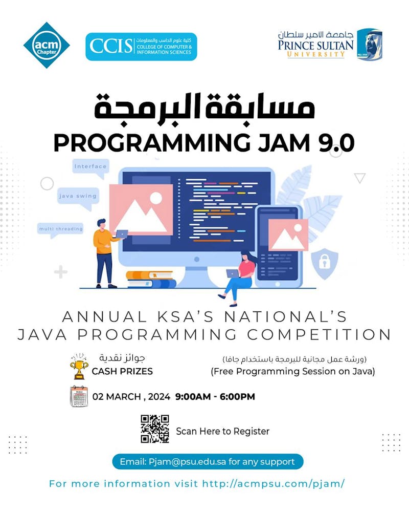 يسر كلية الحوسبة و المعلوماتية دعوة طلبتها للمشاركة في مسابقة البرمجة السنوية التي ستُقام في جامعة الأمير سلطان. تهدف هذه المسابقة إلى تعزيز مهارات البرمجة لدى الطلاب وتشجيعهم على التحدي والإبداع في هذا المجال المثير.