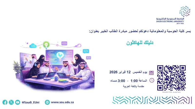 يسر كلية الحوسبة والمعلوماتية باشراف لجنة الأنشطة بالكلية دعوتكم  لحضور مبادرة الطالب الخبير بعنوان "دليلك للهاكثون" حيث سيتم تسجيل ساعات تطوعية للحاضرين بالجلسة.